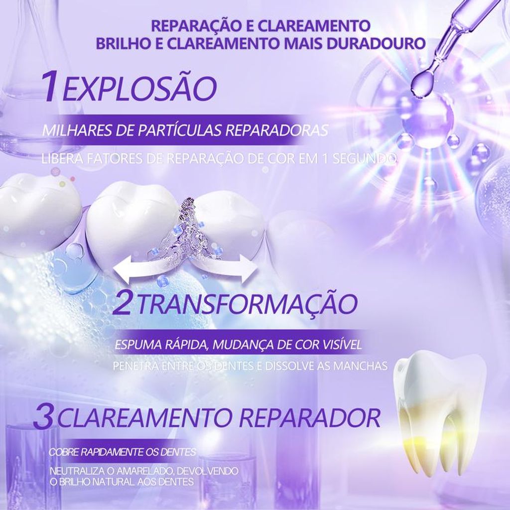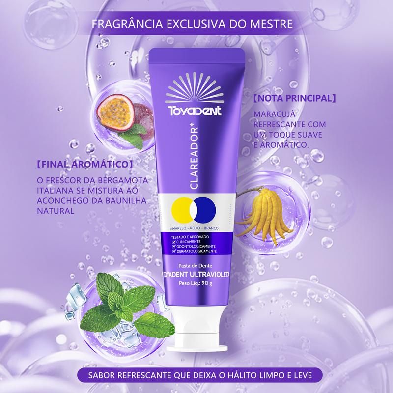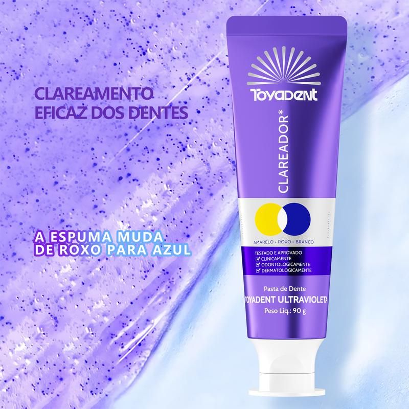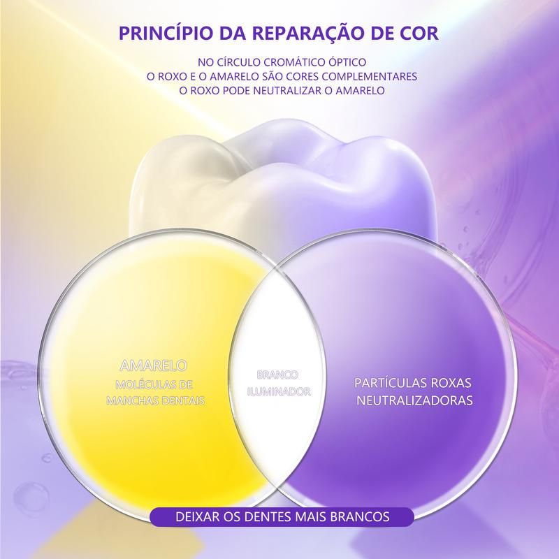 Esta pasta de dente roxa de correção de cor utiliza a tecnologia de neutralização cromática para reduzir manchas amareladas e devolver o brilho natural dos dentes. Limpa profundamente, remove resíduos e proporciona hálito fresco por muito tempo, sem agredir o esmalte dentário.